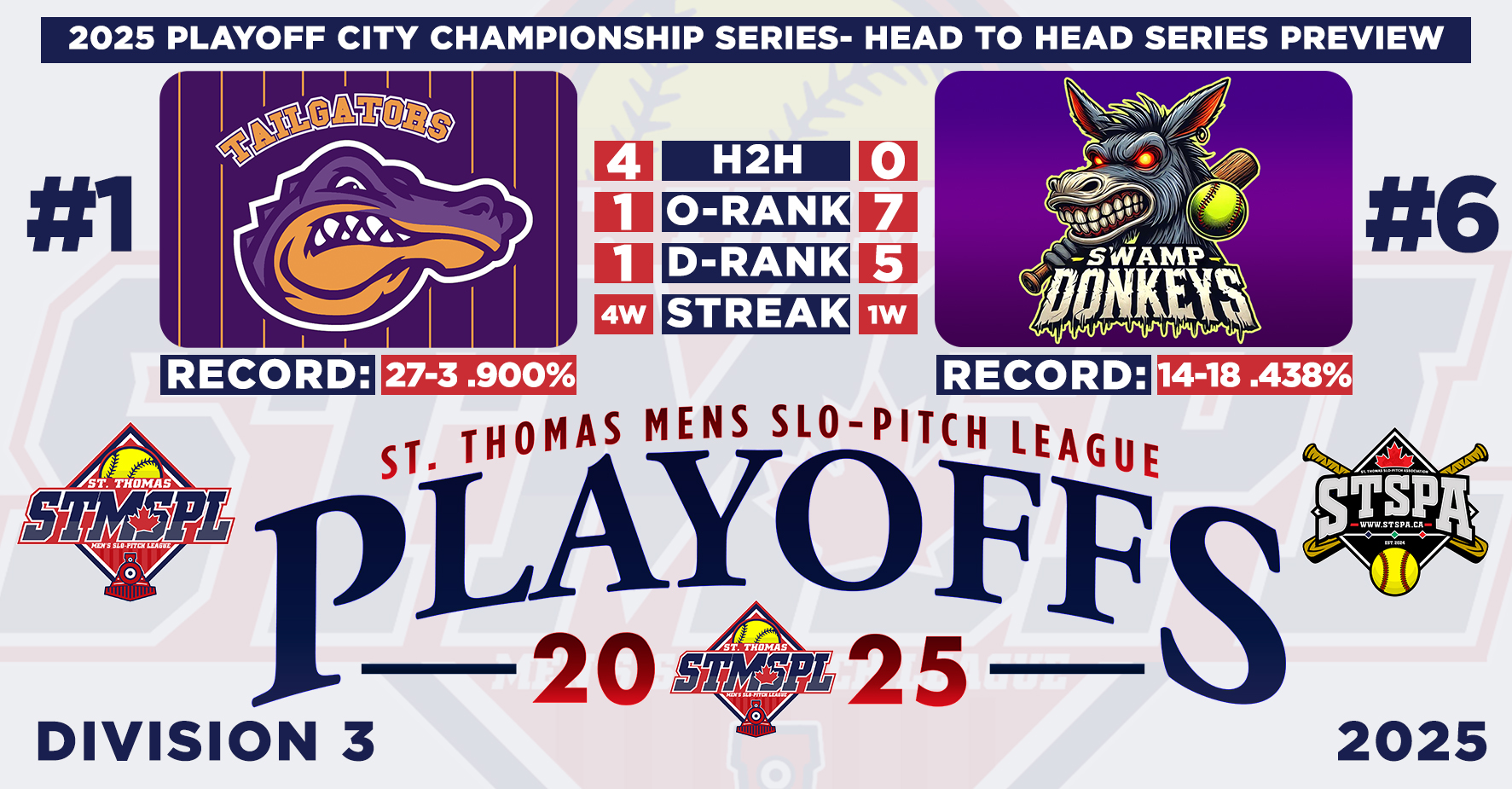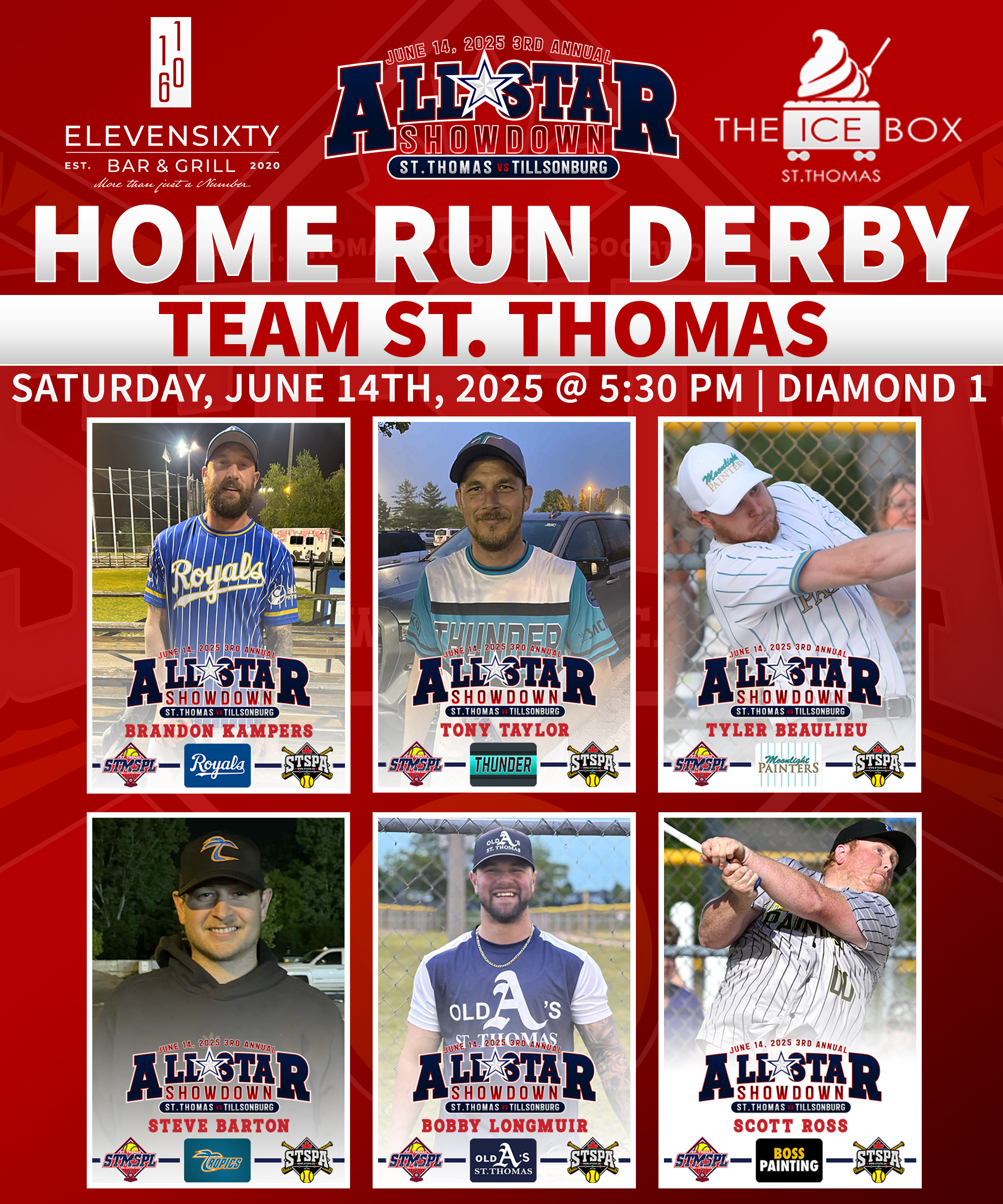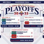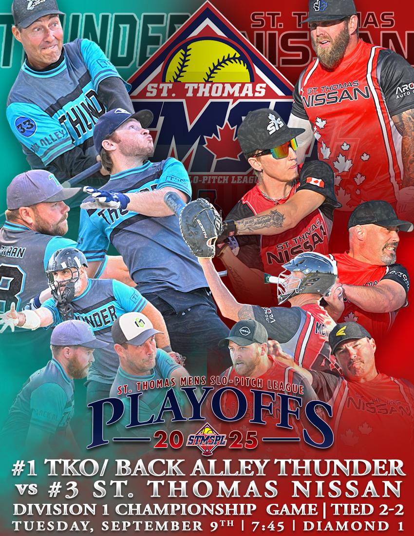 | 6:30 | Complex 1 | St. Thomas Nissan | @ | TKO/Back Alley Thunder | RAIN | ||||