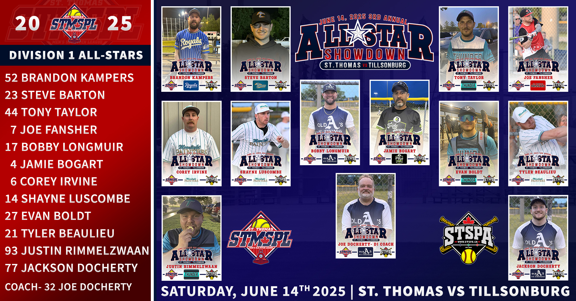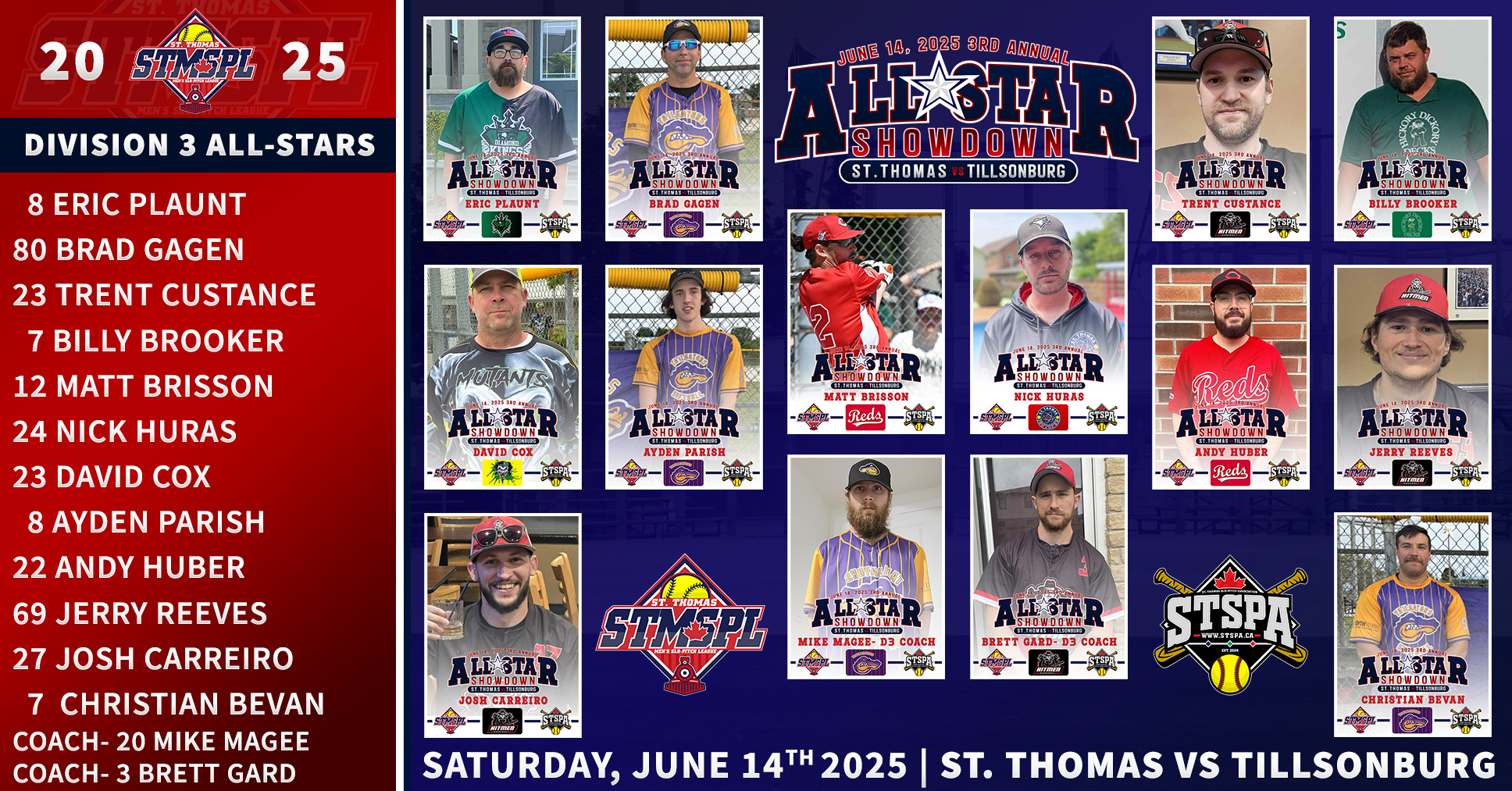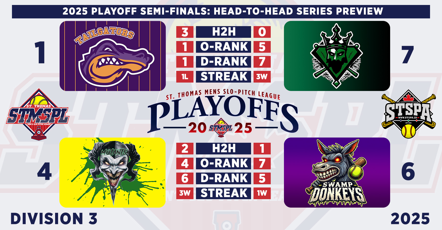 | 6:30 | Complex 1 | St. Thomas Nissan | @ | TKO/Back Alley Thunder | RAIN | ||||