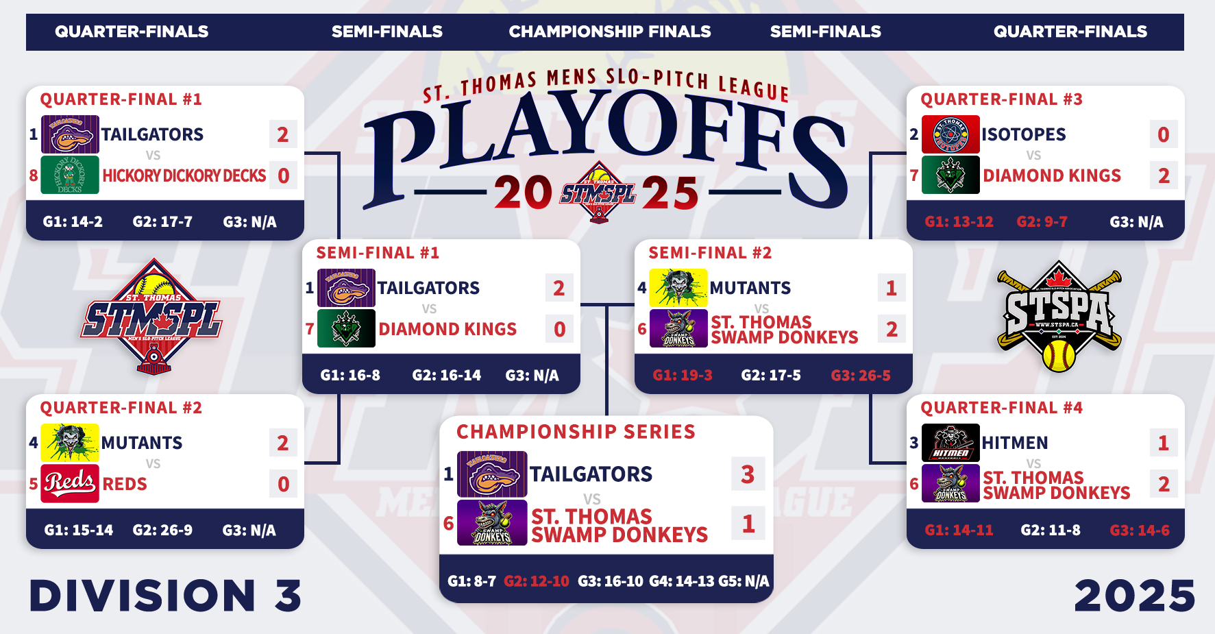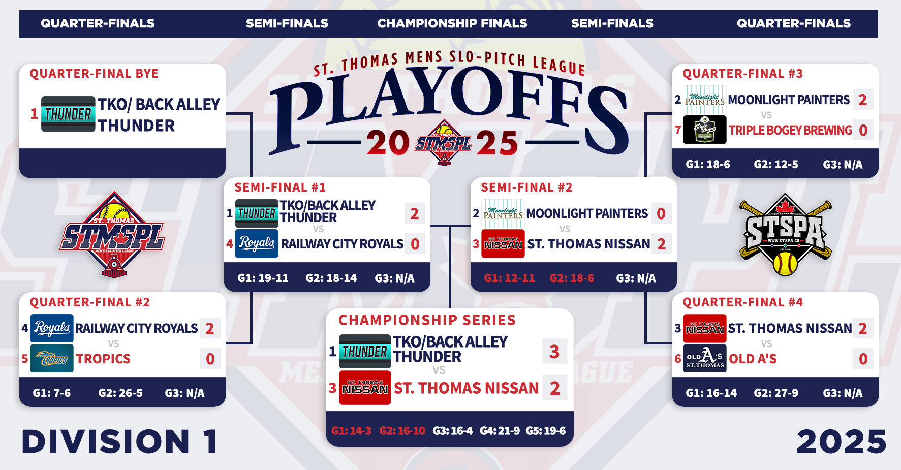 | 6:30 | Complex 3 | TKO/Back Alley Thunder | 30-1 | St. Thomas Nissan | FINAL (5) | ||||