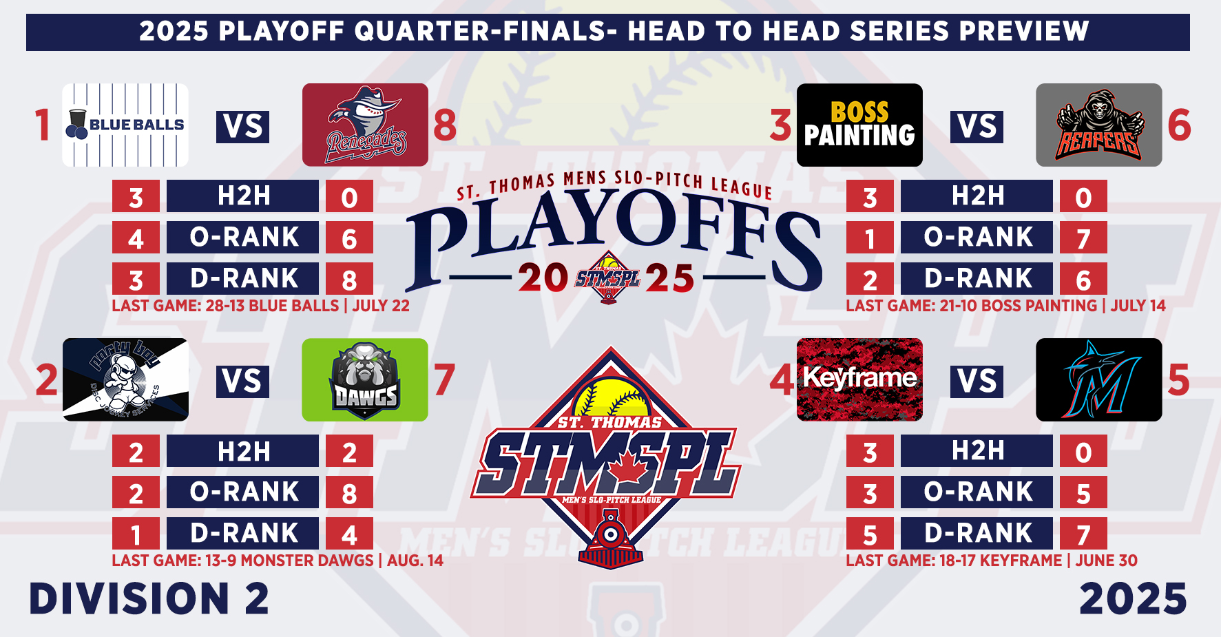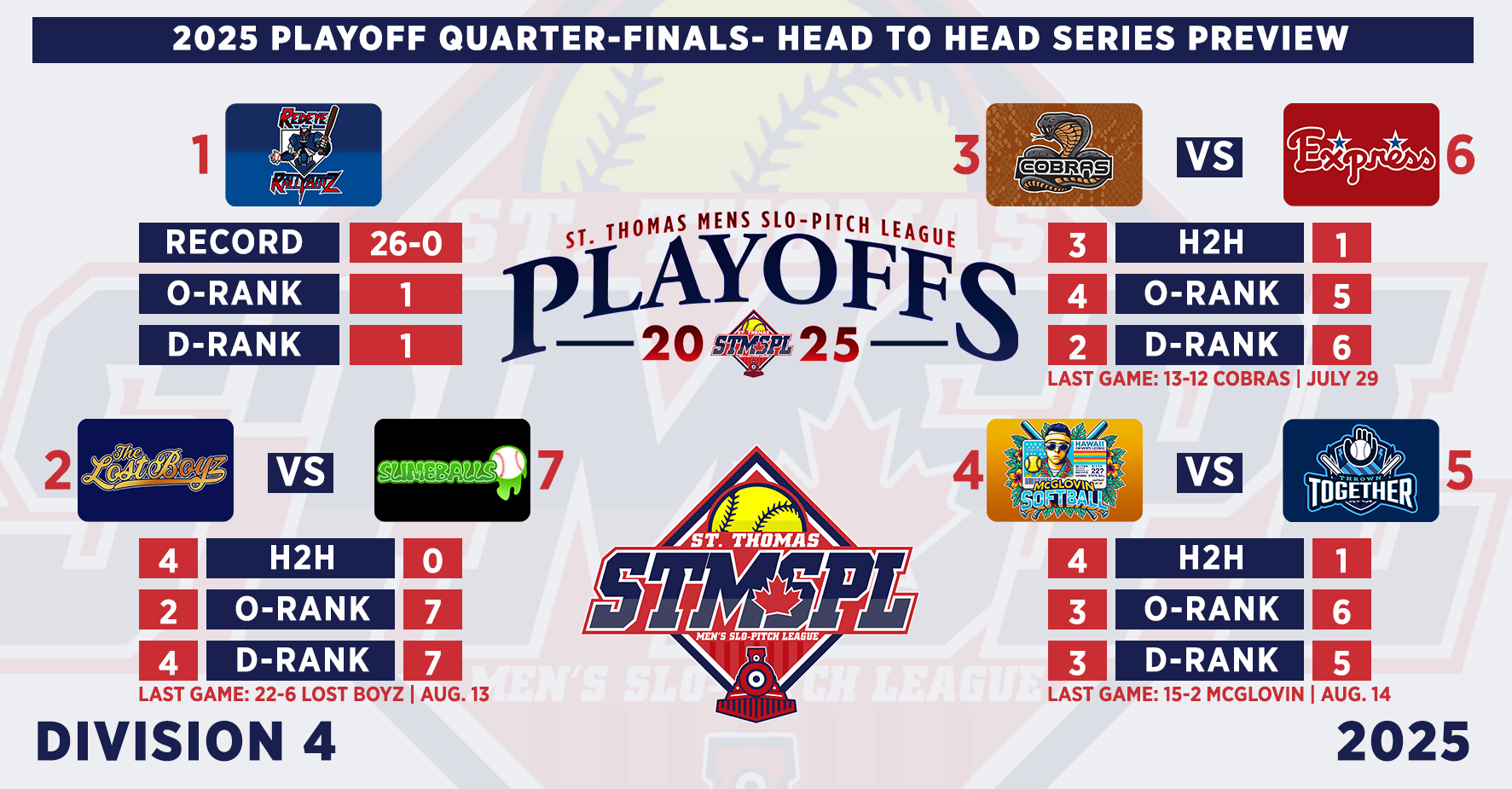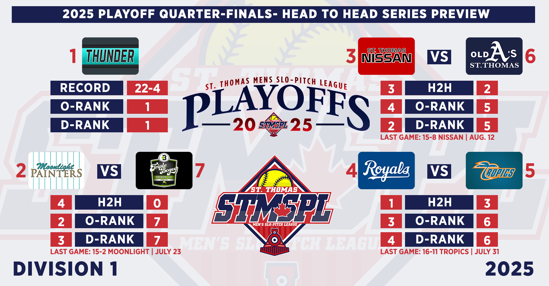 | 6:30 | Complex 1 | St. Thomas Nissan | 13-1 | Triple Bogey Brewing | FINAL (5) | ||||