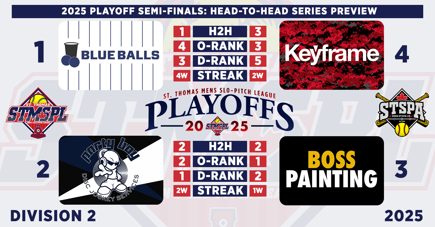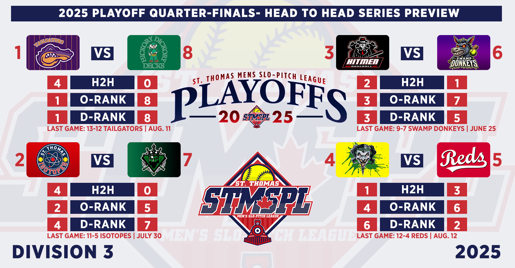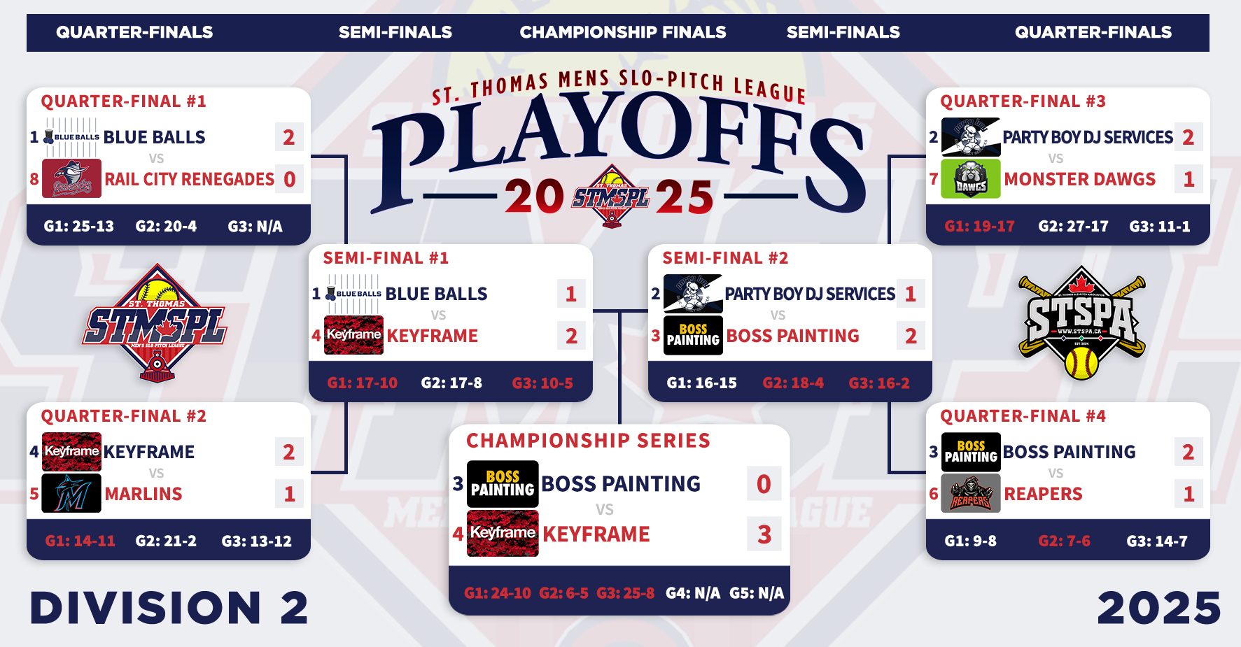 | 6:30 | Complex 1 | St. Thomas Nissan | 13-1 | Triple Bogey Brewing | FINAL (5) | ||||