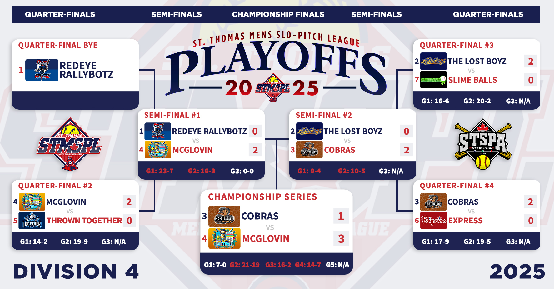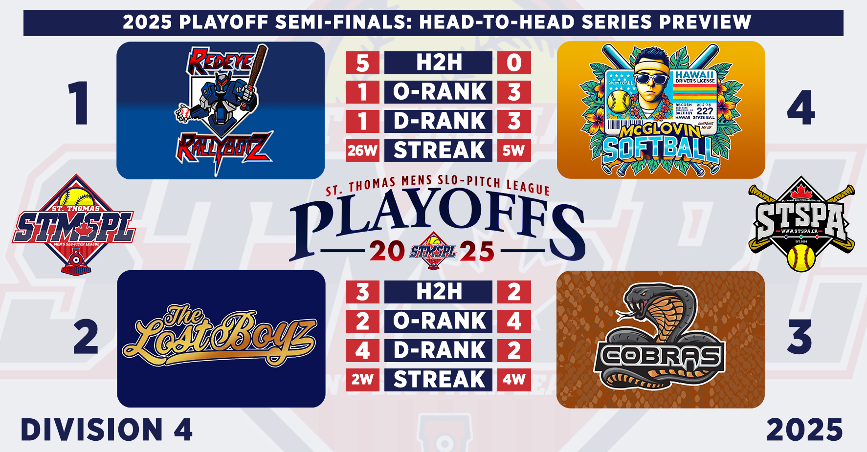 | MENS DIVISION 4 | D4 | M# | GP | W | L | WIN % | GB | RS | RA | DIF | STRK | HOME | AWAY | ||