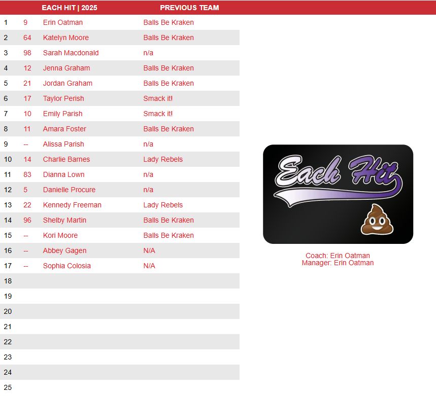 | 9:00 | Complex 1 | | Each Hit |  | 16-8 |  | Show Me Your Hitties | FINAL (6) | |
