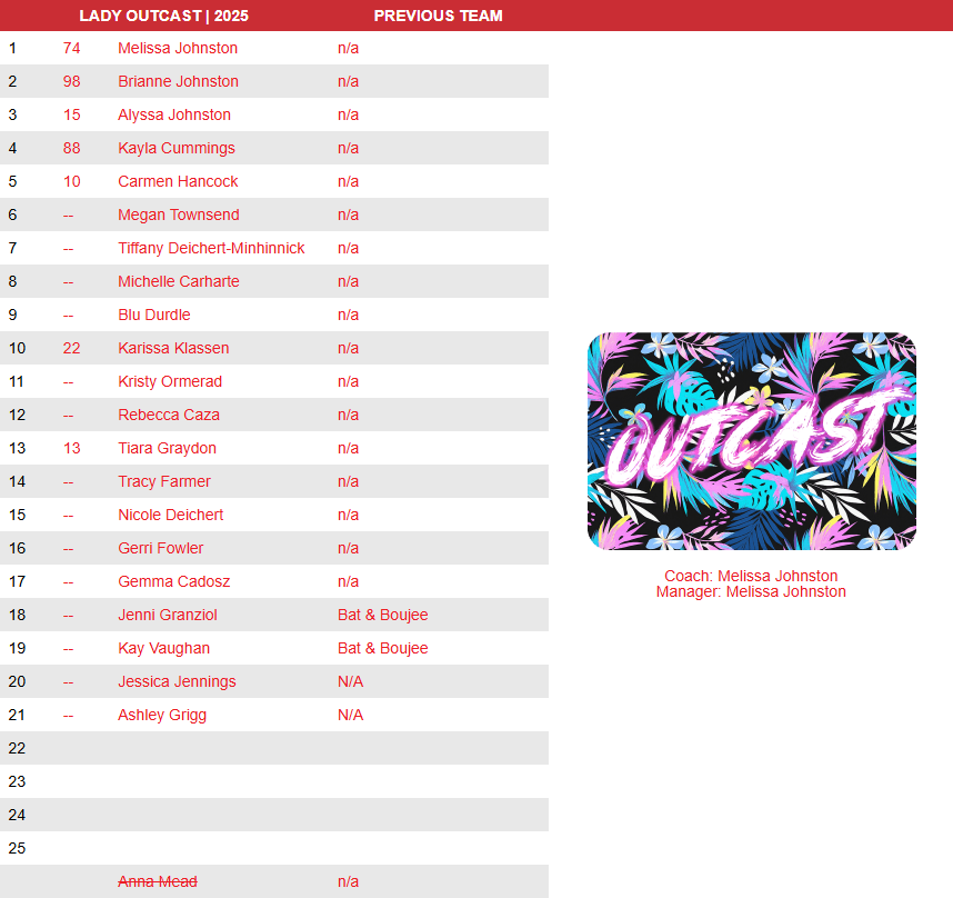 | 6:30 | Complex 4 | | Ball Bashers |  | @ |  | Lady Outcasts | POSTPONED- HEAT | |